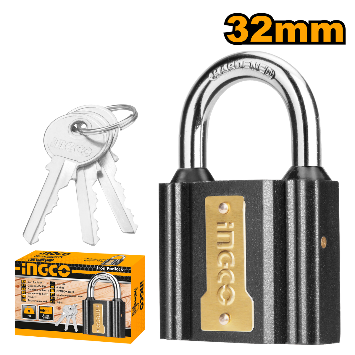 CANDADO HIERRO ARO CORTO •Marca Ingco•Modelo DIPL0301•32 mmCon 3 llaves de hierroCilindro de cerradura de latón Con funda de goma impermeable Apto uso exterior