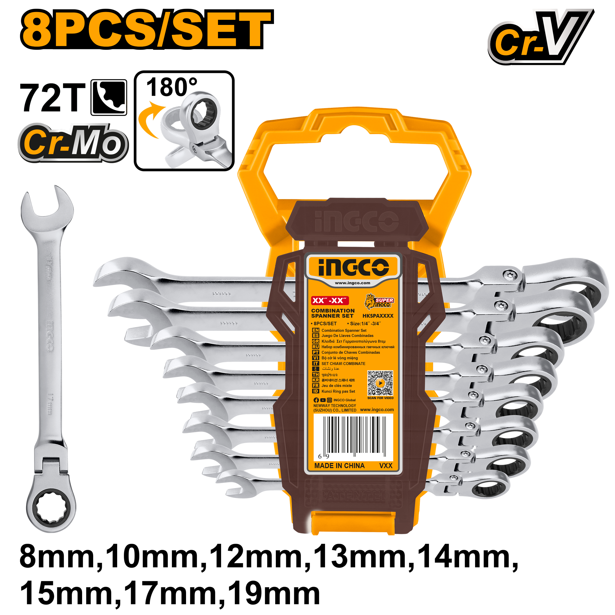 JUEGO DE 8 LLAVES COMBINADAS CON CRIQUET FLEXIBLE • INGCO