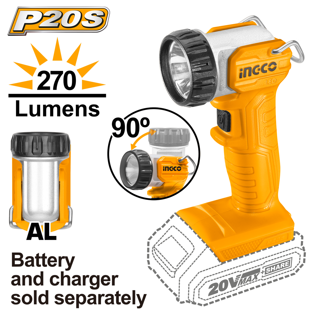 LINTERNA 20V 270 LUMENS - SIN BAT. NI CARGADOR • INGCO