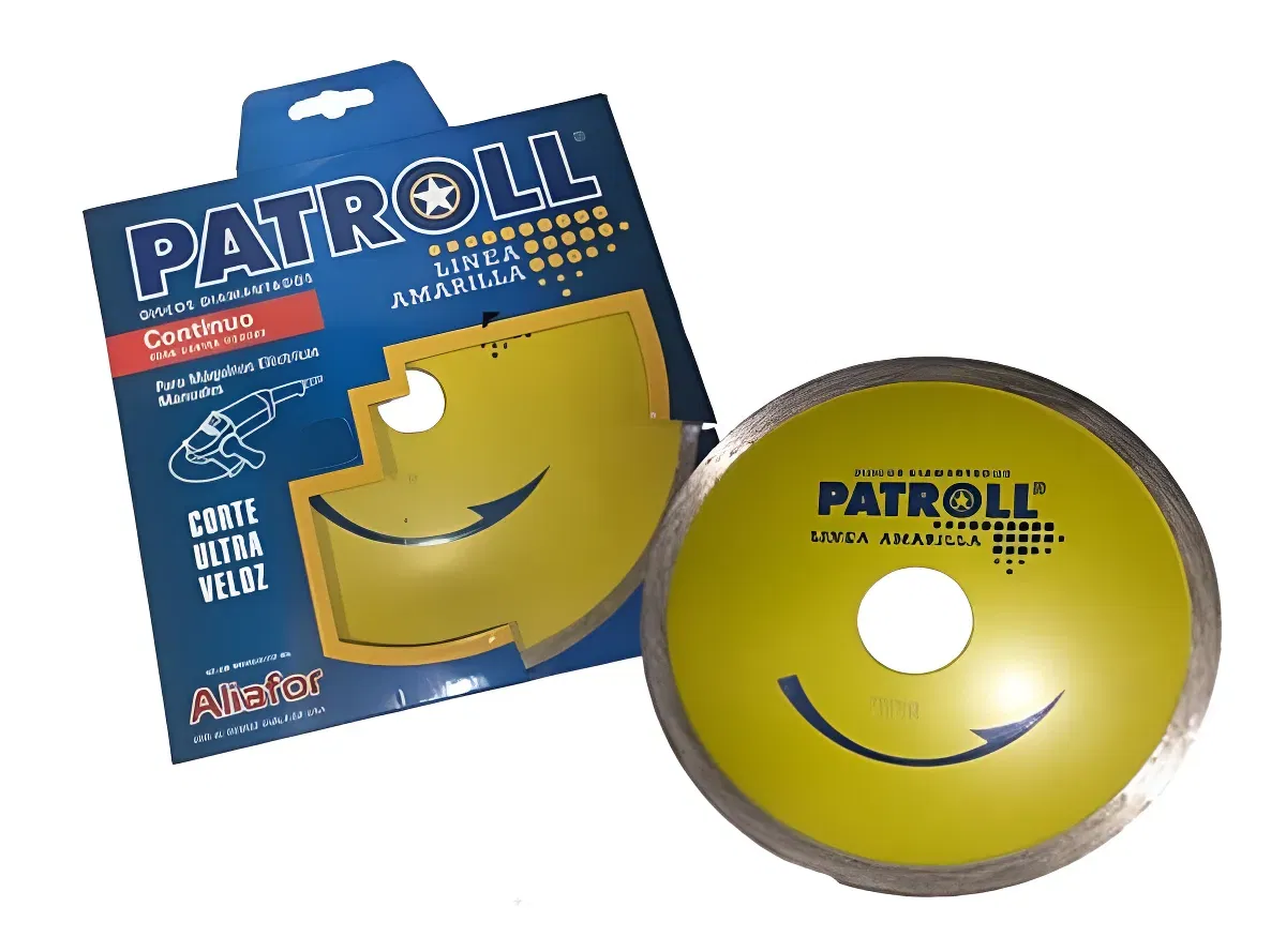 l Disco Diamantado Continuo Patroll de 115 mm, diseñado para ofrecer un corte preciso y eficiente en una variedad de materiales. Este disco es ideal para trabajar con mármol, fibra de vidrio, azulejos, cerámica blanda y dura, cristales, vidrios, porcelanas y porcelanatos, así como tejas coloniales.